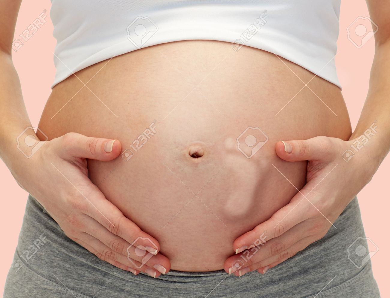 Immagini Stock La Gravidanza La Maternita Le Persone E Il Concetto Aspettativa Primo Piano Di Donna Incinta Di Toccare La Sua Pancia Nuda Con Calci Bambino Impronta Su Sfondo Rosa Image