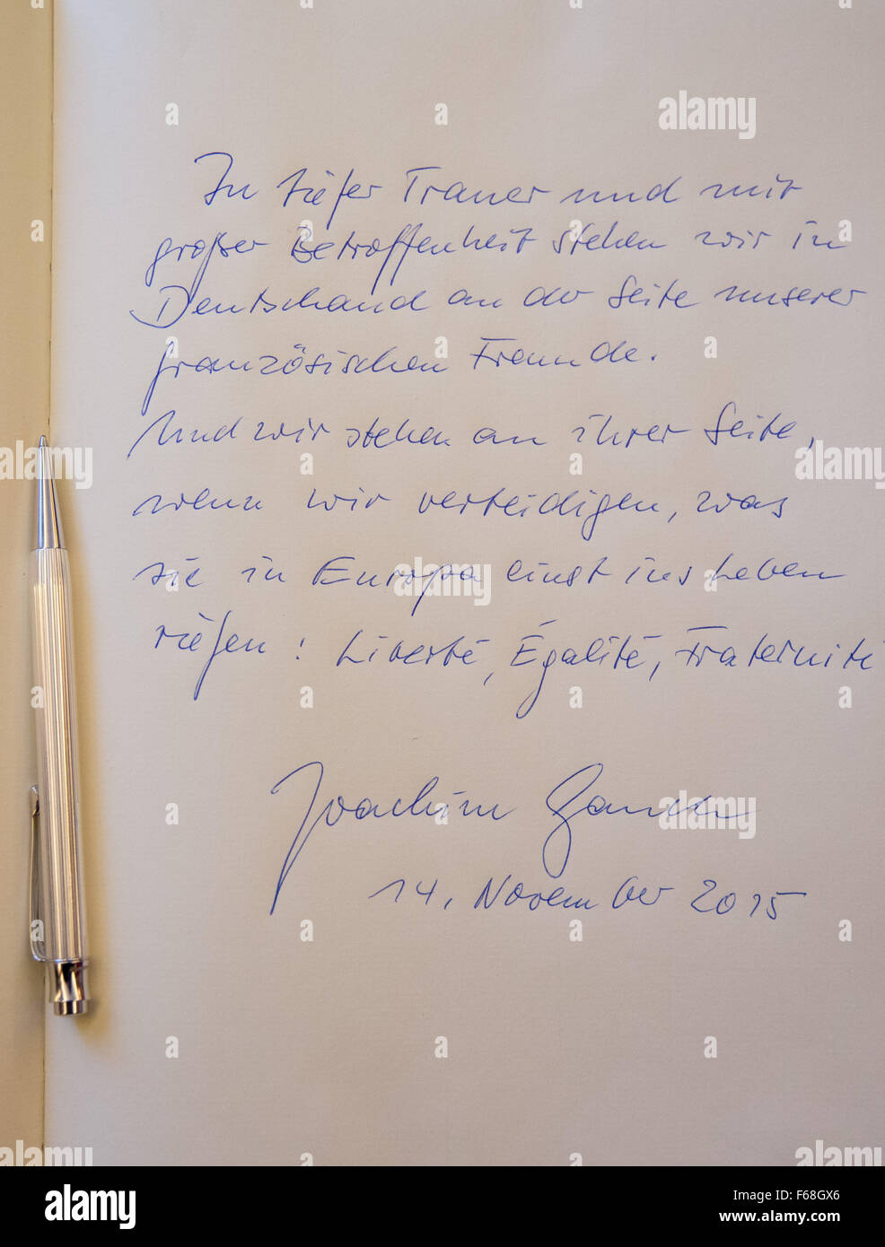 Il Testo Immesso Nel Libro Di Condoglianze Dopo La Parigi Degli Attacchi Terroristici Dal Presidente Tedesco Joachim Gauck Presso L Ambasciata Di Francia A Berlino Germania 14 Novembre 15 In Tiefer Trauer