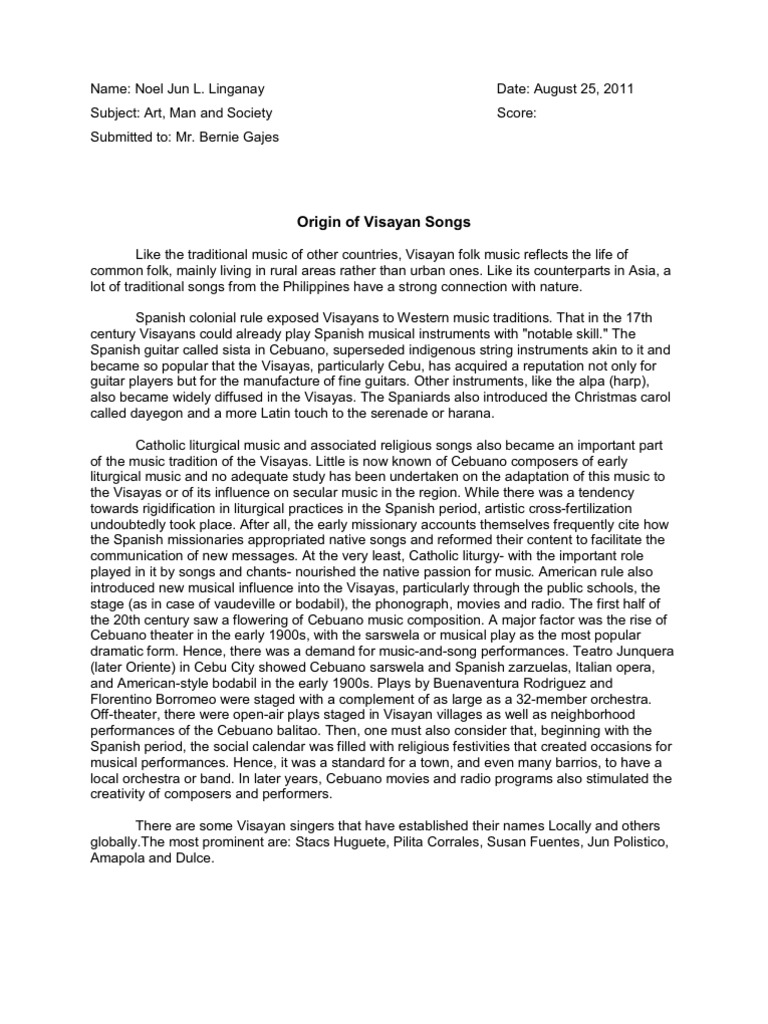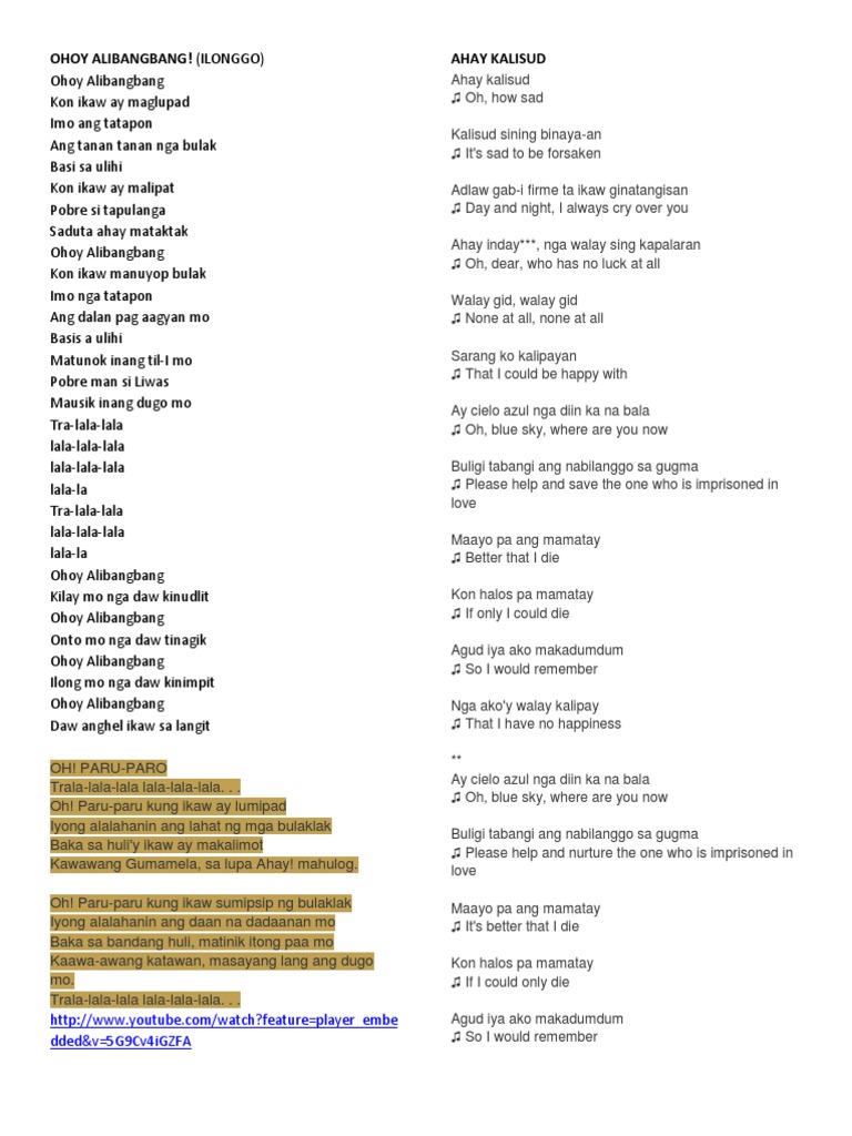 A series of alog movie musicals based on the compositions of Suarez The soprano and baritone texts are contrary to each other, with the former being idealistic, extolling the simple but honorable Filipino whose pain and sufferings are assuaged by the beauty of the kundiman and balitaw, while the latter landing on a more realistic plane, speaks of a love symbolized by a discarded bakya. Sep 17, 18Sa araling ito ay bibigyangpansin at itatampok ang mga awiting bayang Bisaya o Visayan folksongs at mga bulong sa Bisaya 4 Sa ibaba ay mababasa at maaari ring sabayan ang iba’t ibang awitingbayang nasusulat sa tatlong wikang Bisaya, ang Waray, Waray ng Samar at Leyte, ang Hiligaynon ng pulo ng Panay, at ang Sugbuwanon ng Cebu at Negros 5. Alog Lyrics by Romulado G Ramos 1930 April 17 Tayo'y Pakasal na Vocal, Sarswela A song from a sarswela by Servando de los Angeles 1930 Reminiscenes Vocal Favorite song of Isagani Velayo's grandmother transcribed by Abelardo alog Lyrics by Valentin Abelardo 1930 April 7 Ay Kalisud.