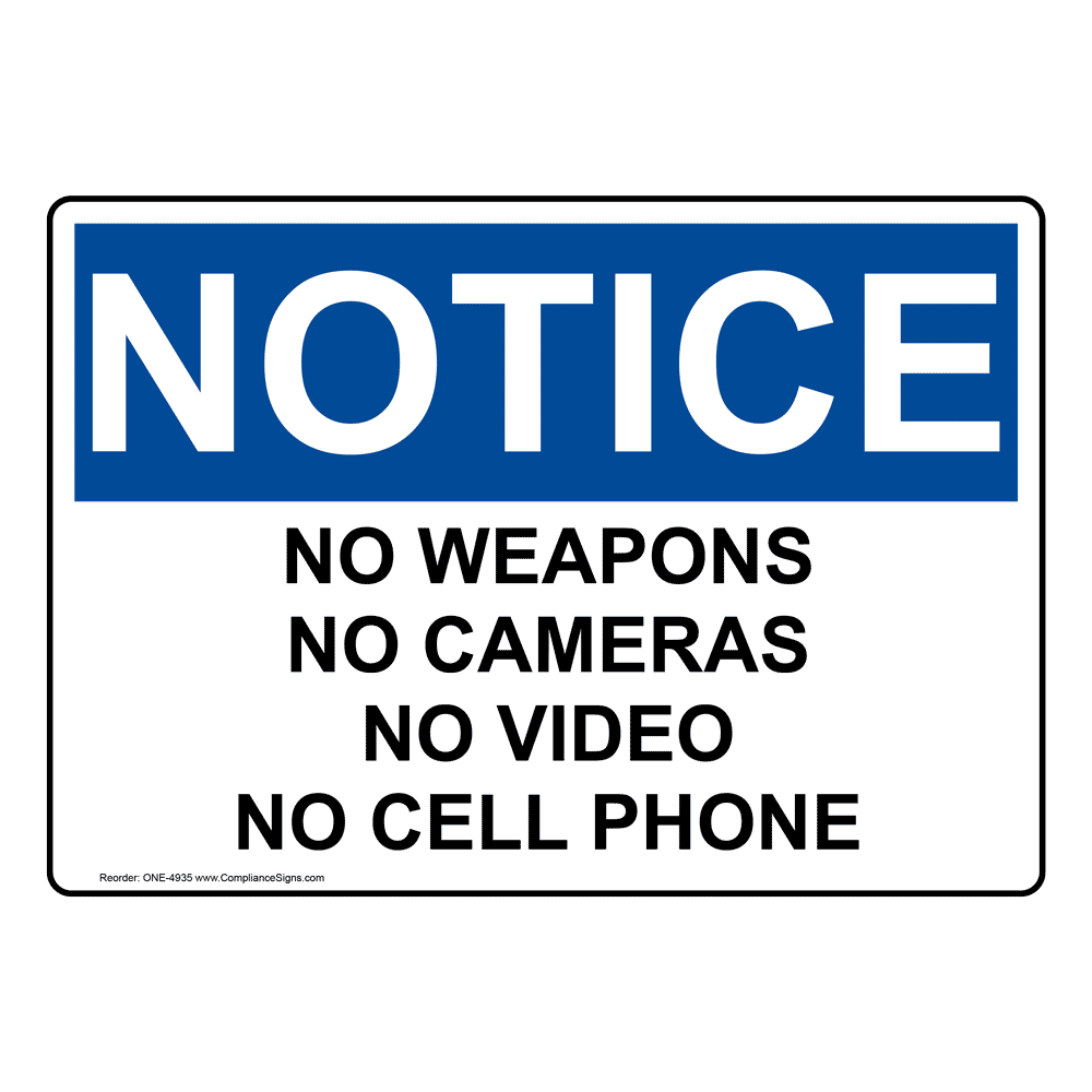 Contact Us Need Help Compliance Signs Search Fast Accurate Delivery Hello Sign In For Account Orders 0 Cart Shop By Category Custom Products Osha Notice No Weapons No Cameras No Video No Cell Phone Sign One 4935 Osha Notice No