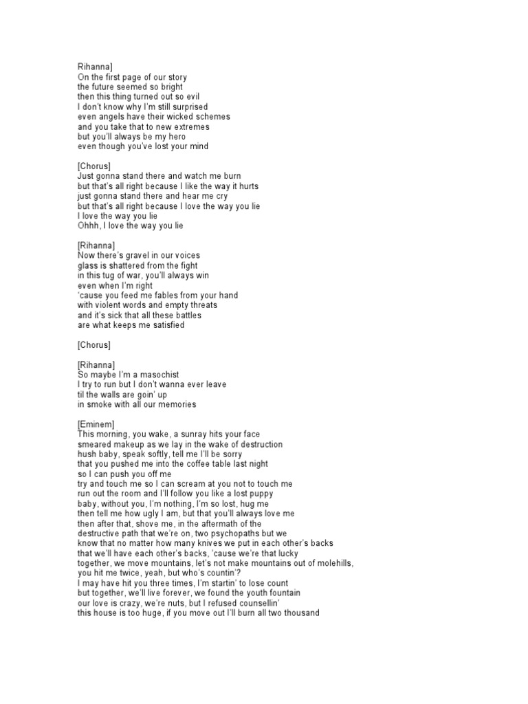 Testo di Love The Way You Lie;. Testo Love The Way You Lie (Feat Eminem) Just gonna stand there and watch me burn Well, that's all right, because I like the way it hurts Just gonna stand there and hear me cry Well, that's all right, because I love the way you lie I love the way you lie I can't tell you what it really is. Well, that`s all right because I love the way you lie I love the way you lie Verse 1 Eminem I can`t tell you what it really is, I can only tell you what it feels like And right now, there`s a steel knife in my windpipe I can`t breathe, but I still fight while I can fight As long as the wrong feels right, it`s like I`m in flight.