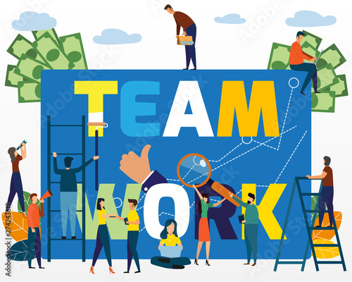 Flat Concept Of Small People Together Build Word Teamwork Abstract Design Graphic Construction Business Project Vector Illustration Stock Vector C Leila Vi
