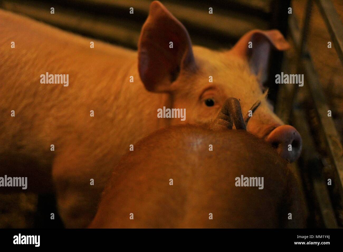 Psicologia Animale Immagine Ravvicinata Di Un Maiale Curioso All Interno Di Un Fienile In Una Fattoria Di Essex Parte Posteriore Di Un Altro Suino In Background Foto Stock Alamy