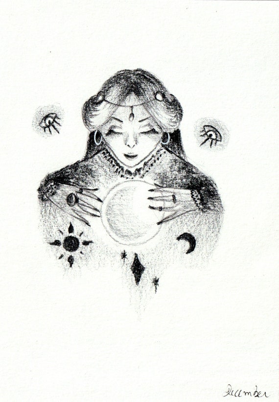 Seance Fortune Teller Original Art Illustration Black White Etsy