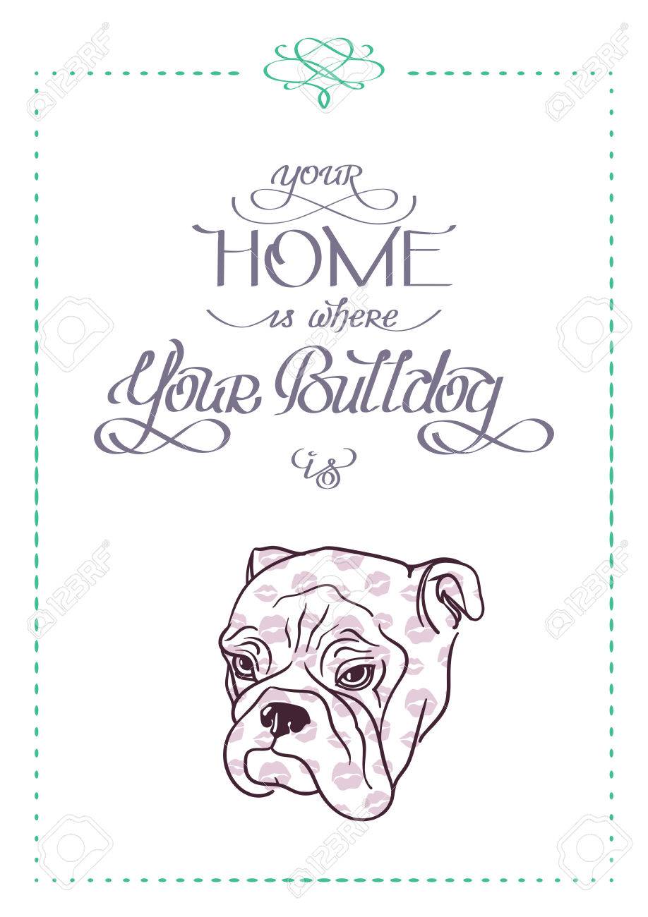 Vettoriale La Tua Casa E Dove Il Vostro Bulldog E Mano Lettering Con Ritratto Schizzo Di Bulldog Inglese Image