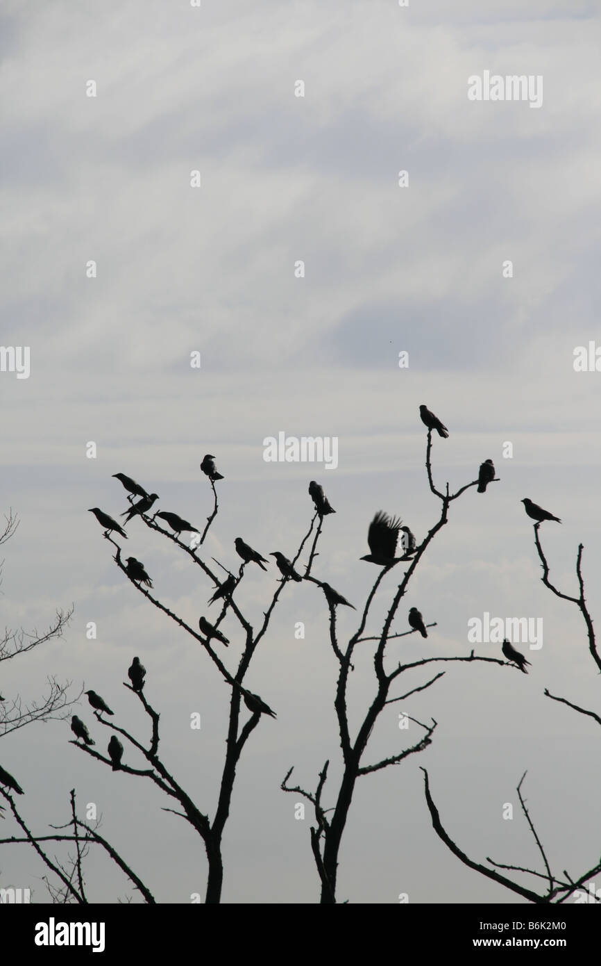 Molti Uccelli Neri Arroccato Su Bare Tree Top Nei Boschi Foto Stock Alamy