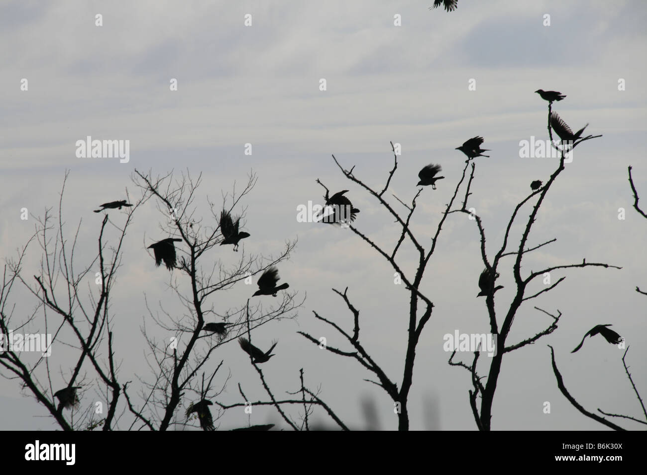 Molti Uccelli Neri Che Volare Da Nudo Tree Top Nei Boschi Foto Stock Alamy