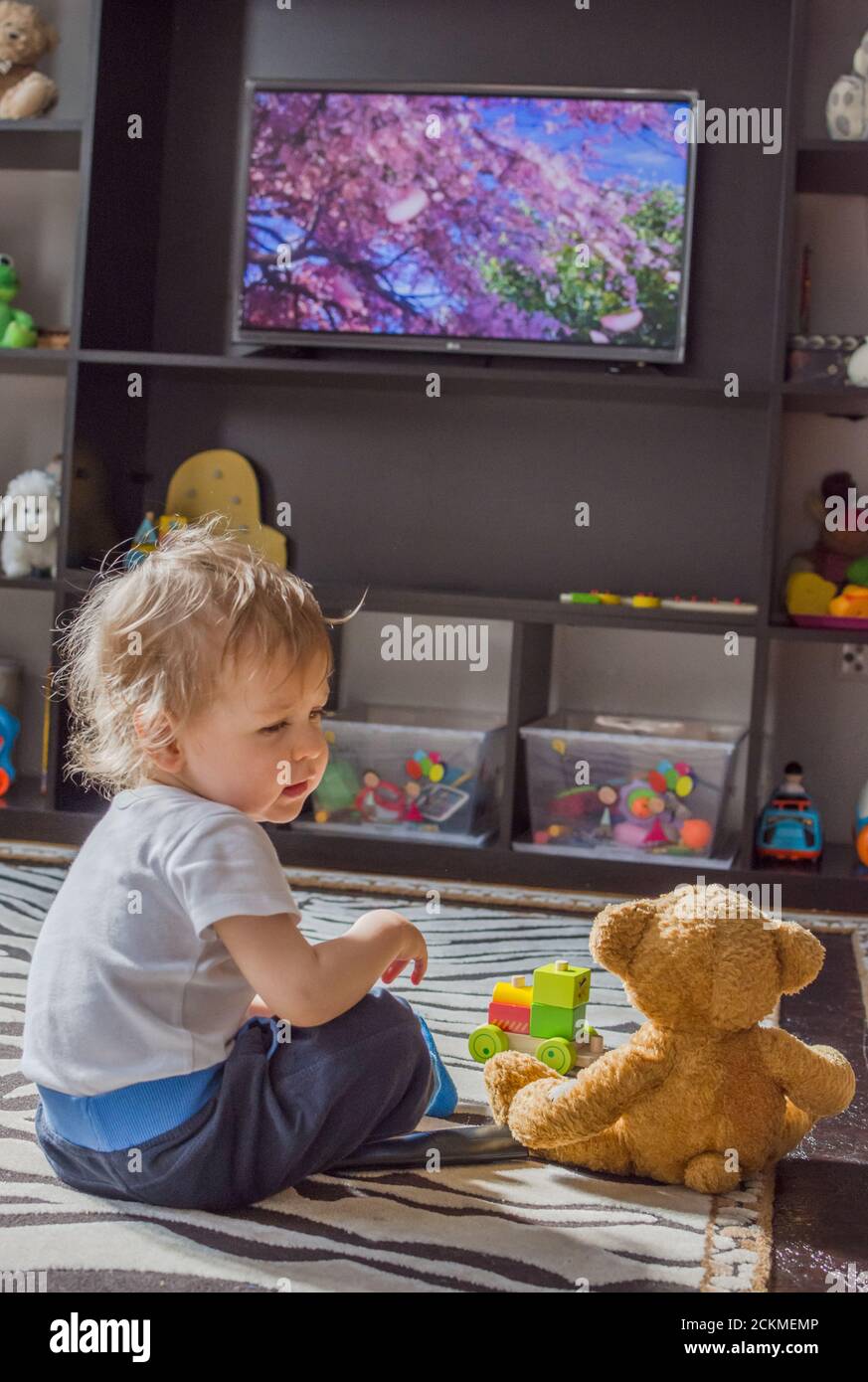 Kid And His Teddy Bear Watching Tv Stock Photo Alamy