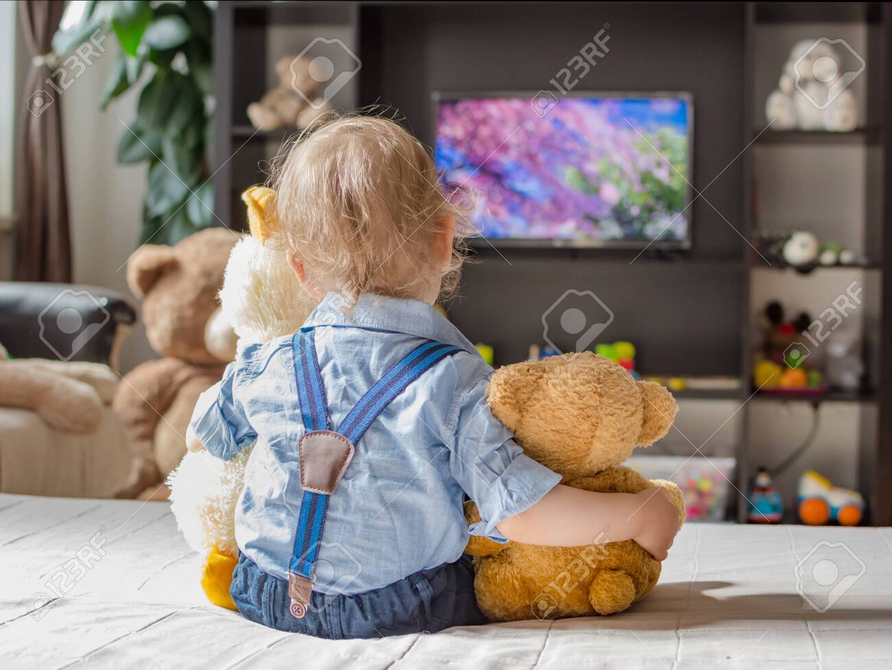 Kid With Teddy Bear Watching Tv Stock Image K Fotosearch