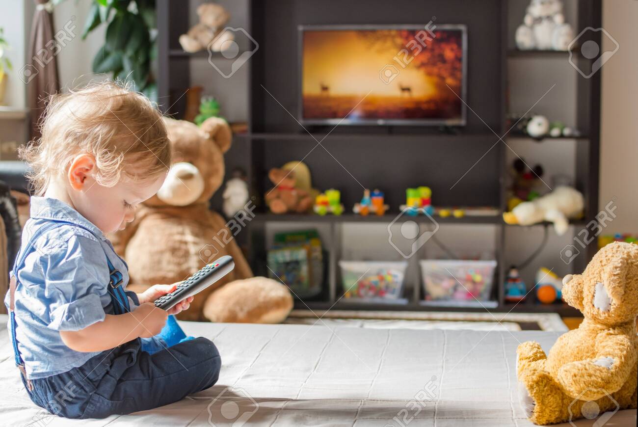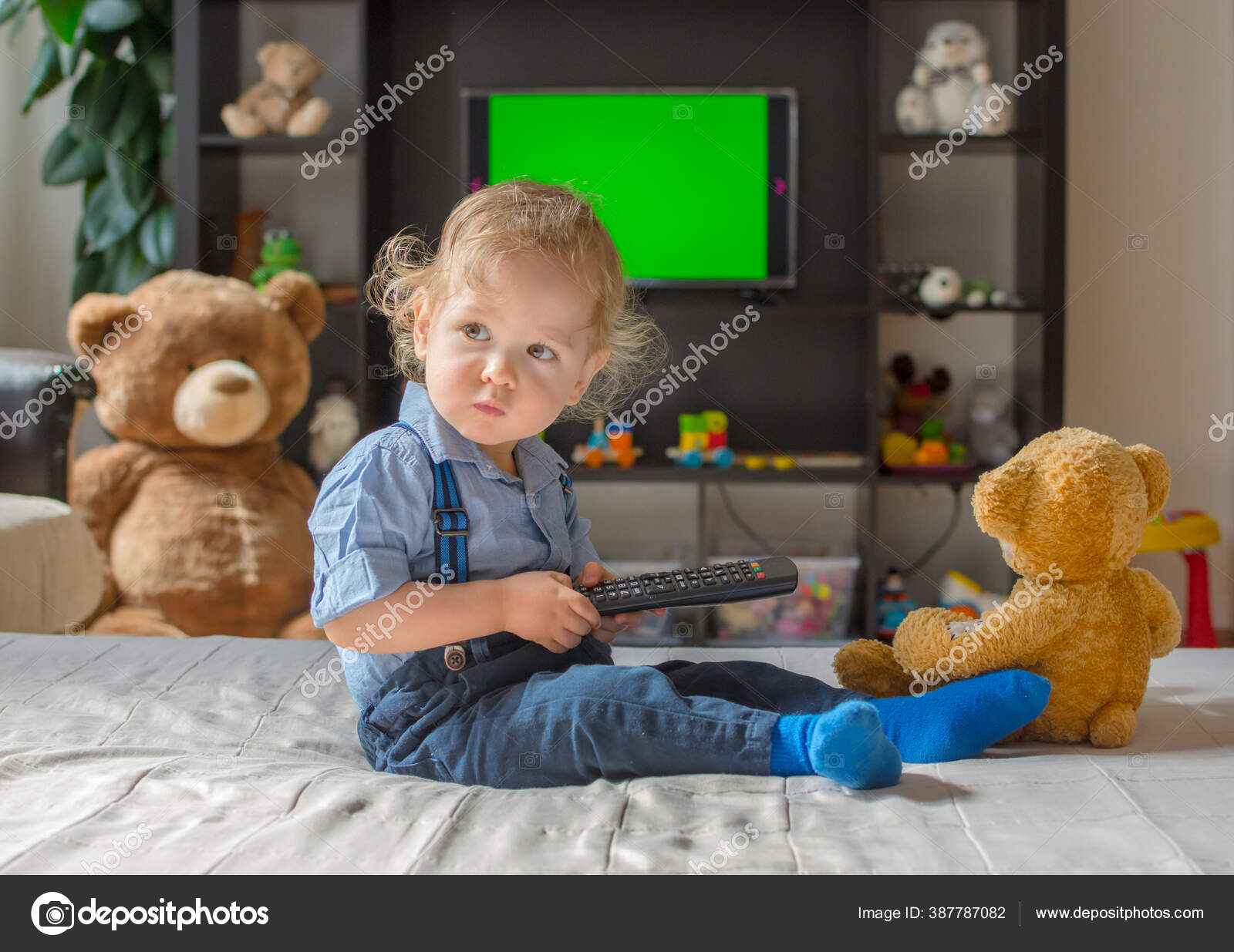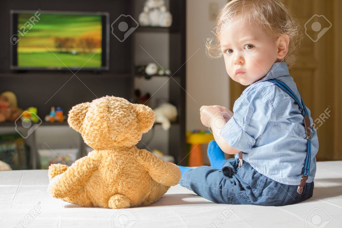 Cute Baby Boy And His Teddy Bear Watching Tv Sitting On A Couch In The Living Room At Home Stock Photo Image Of Addiction Controller