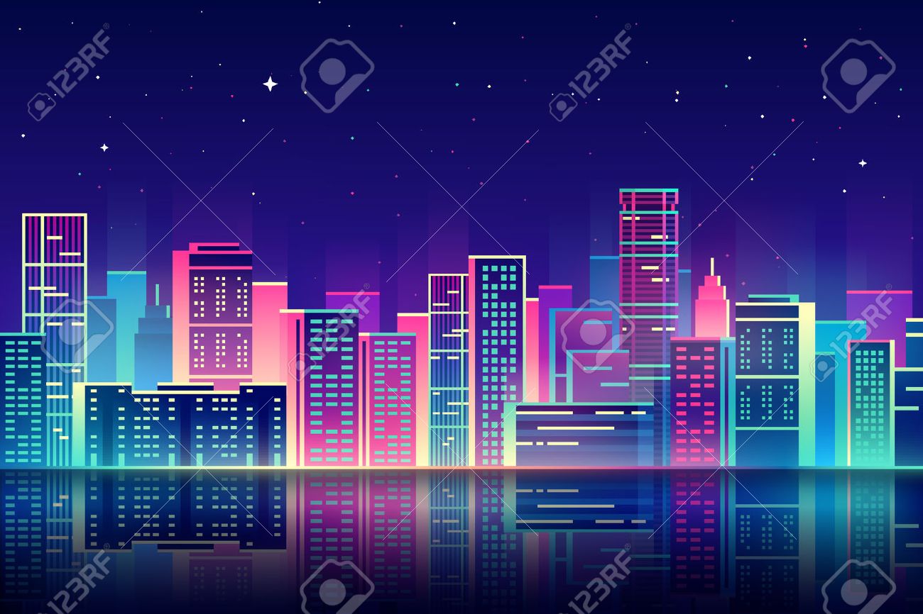 Vettoriale Notte Illustrazione Citta Con Incandescenza Al Neon E Colori Vivaci Image