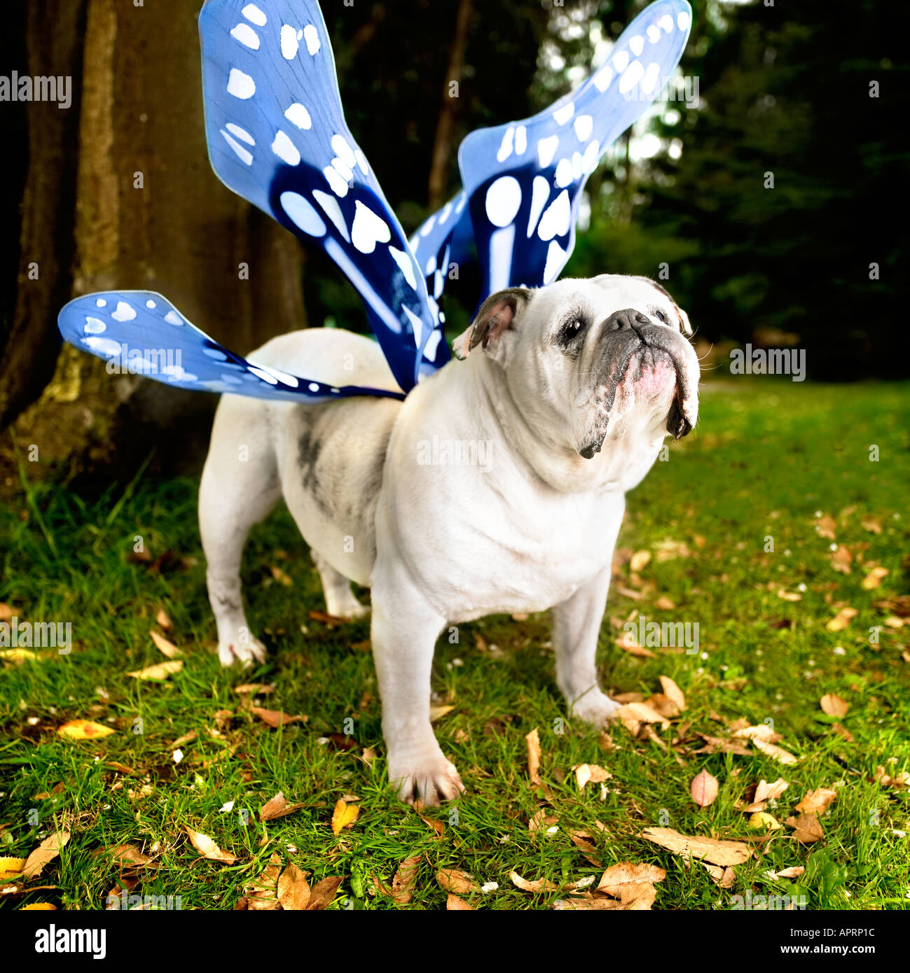 Un Bulldog Inglese Con Ali Blu Sorge Accanto Ad Un Grande Albero E Sguardi Verso Il Cielo Foto Stock Alamy