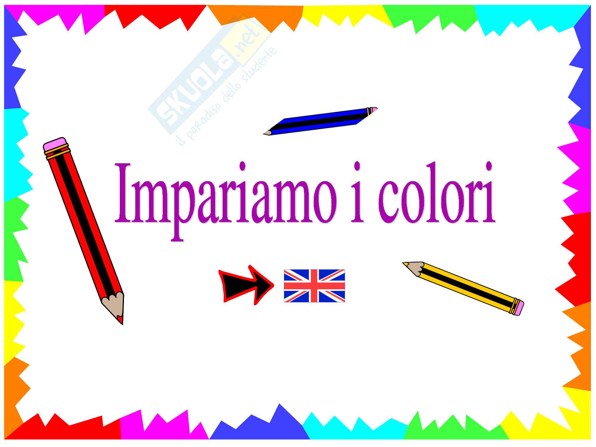 Rispondiamo alla richiesta di un affezionato lettore e pubblichiamo una tesina di terza media che ha come argomento i colori Storia =Il Fascismo (il nero) Geografia =Il Medio Oriente (focus sul Libano>il porpora) Italiano ="I limoni" di Montale (il giallo) Scienze =L'ecologia (Il verde) Inglese =Il Grande Gatsby di FS Fitzgerald (il giallo) Francese ="IL rosso e il nero" di Stendhal (il. Esercizi sui colori in inglese Traduci Esercizi sui colori in inglese Trascina la. Tante schede didattiche da stampare per bambini per imparare i nomi dei colori in inglese grazie a giochi ed esercizi di verifica divertenti ed educativi Salvato da Pianetabambiniit 94.