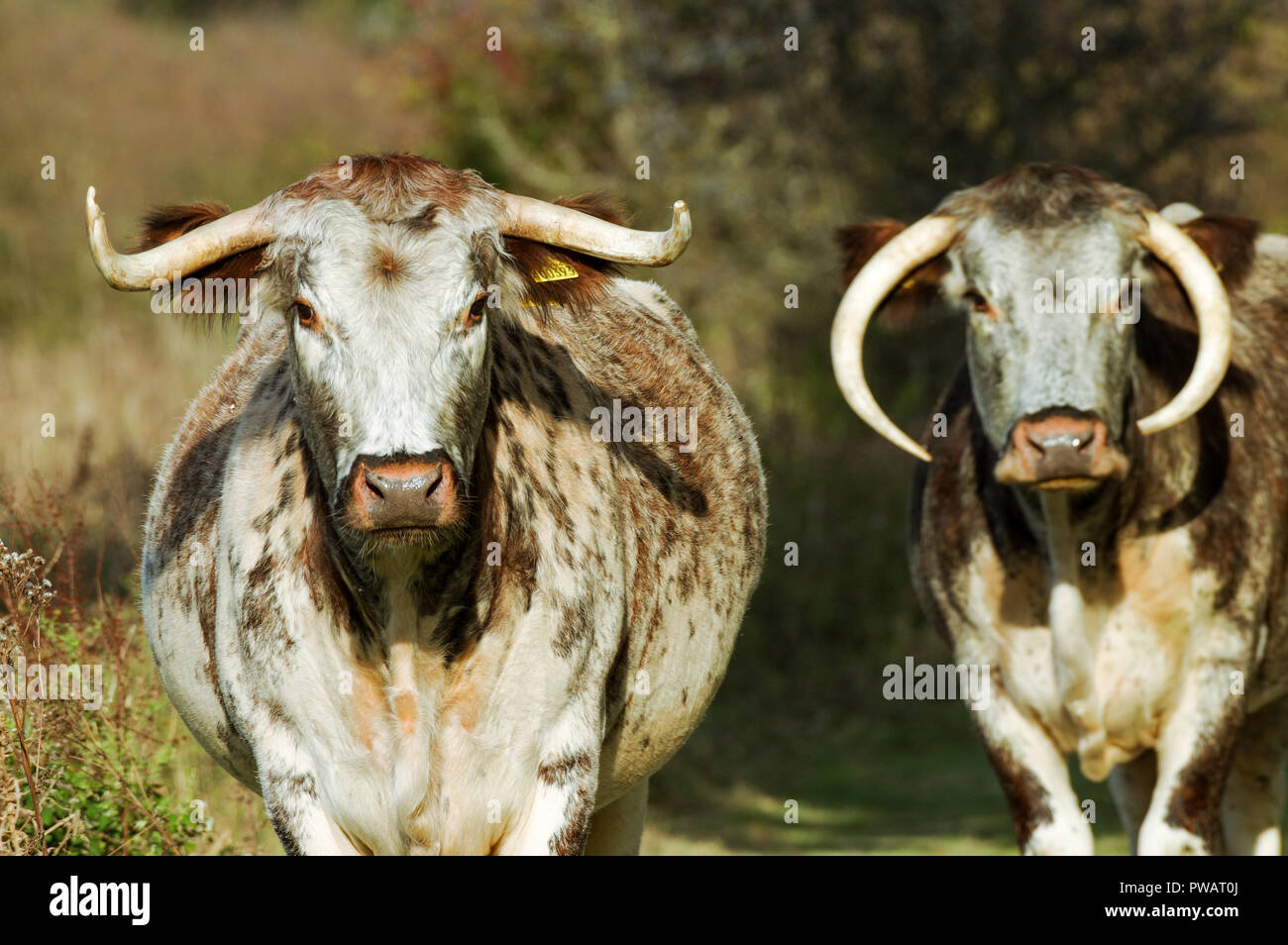 Inglese Longhorn Bovini Madre Con Vitello Per Motivi Di Knepp Estate In West Sussex Foto Stock Alamy