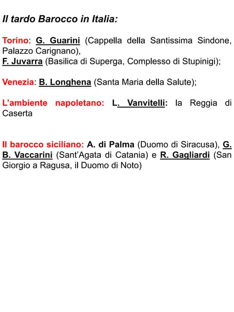 Pittura In campo pittorico, il barocco irrompe sulla scena genovese con il soggiorno di Peter Paul Rubens, datato fra il 1604 e il 1608A Genova il pittore fiammingo, reduce dal soggiorno romano in cui era entrato in contatto con la pittura di Caravaggio e dei Carracci, lascia in particolare il Ritratto equestre di Giovanni Carlo Doria, 1606 (Genova, Galleria Nazionale della Liguria a Palazzo. Il tardo barocco barocco maturo) (anno di morte di bach, luglio) concetti base musica strumentale/musica vocale il primo concetto questo della musica. Il tardo classicismo barocco fu rappresentato da Carlo Maratta (1625 – 1713) a Roma che nei fatti fu il vero fondatore di quell'Accademia romana che impose un indirizzo classicheggiante alla cultura del secondo Settecento Nei primi anni del XVIII secolo la pittura napoletana ebbe come caposcuola Francesco Solimena (1657 – 1747) considerato uno degli artisti che meglio incarnarono la cultura tardobarocca in Italia ed i suoi allievi occuparono posizioni chiave in quel secolo a Torino.