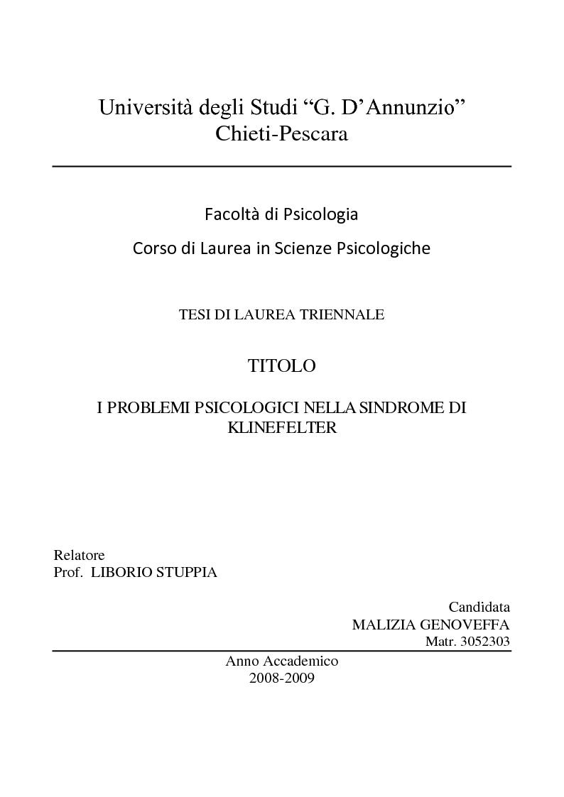 D Annunzio Chieti Pescara Facolta Di Psicologia Corso Di Laurea In Scienze Psicologiche Tesi Di Laurea Triennale Titolo I Problemi Psicologici Nella Sindrome Di Klinefelter Relatore Prof Tesionline