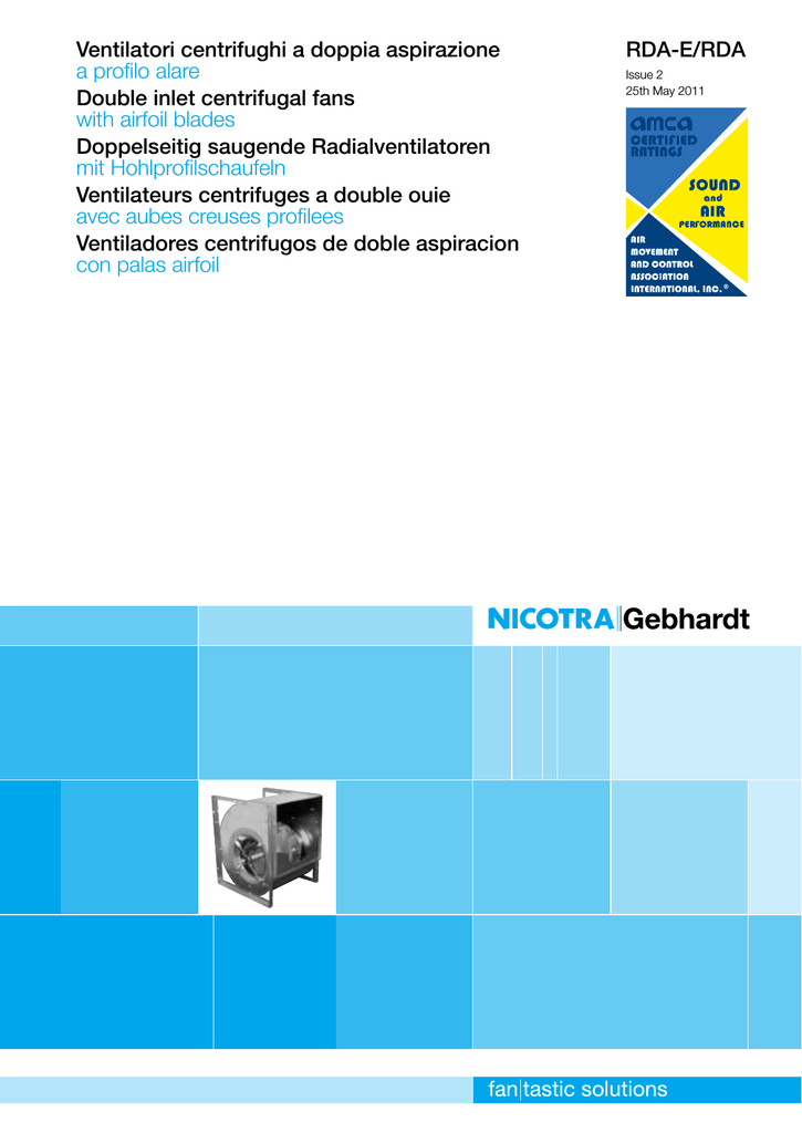 Nicotra SpA certifica che i ventilatori serie AT, versioni S, SC, C, AR e TIC, rappresentati in questo catalogo, sono autorizzati a portare il Marchio AMCA Le prestazioni indicate sono basate su prove e procedure in accordo con il documento AMCA 211, e soddisfano i requisiti del Programma AMCA per la Certificazione delle Prestazioni. Ventilatori centrifughi a doppia aspirazione serie dDM/dd Ventilatori Nicotra ddm versione 3 velocità Versione monofase Modello Alim Poli Vel Pot Max T max Portata ERP Kw max mc/h. البحث عن شركات تصنيع Nicotra Ventilatori موردين Nicotra Ventilatori ومنتجات Nicotra Ventilatori بأفضل الأسعار في Alibabacom.
