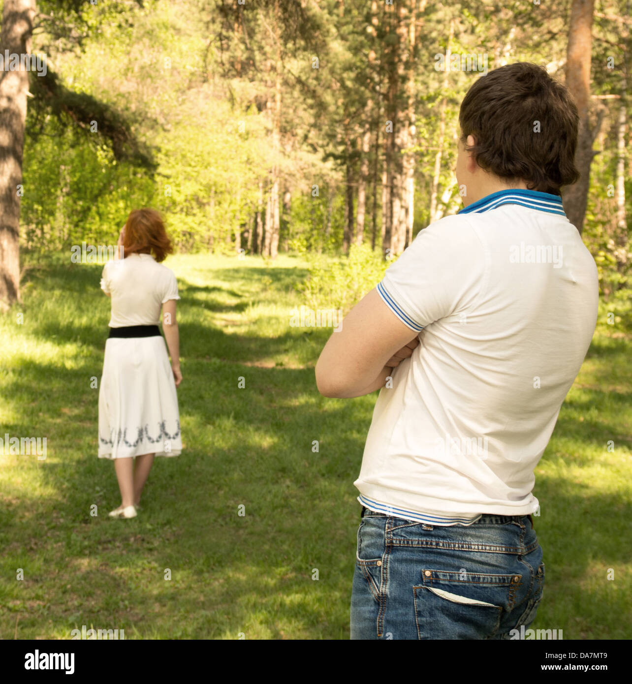 Divorzio Conflitto Il Concetto Di Separazione I Problemi Di Coppia Infelice Donna Moglie Andando Via Da Uomo Marito All Aperto In Estate Park Foto Stock Alamy