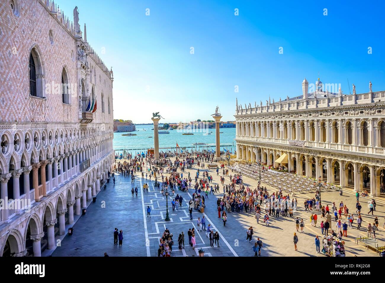 Venise Italie 30 Mars 17 Vue Sur La Place Saint Marc Piazza San Marco Avec La Cathedrale Campanile Les Touristes Dans La Ville De Venise Au Printemps Piazza San Marco Est La