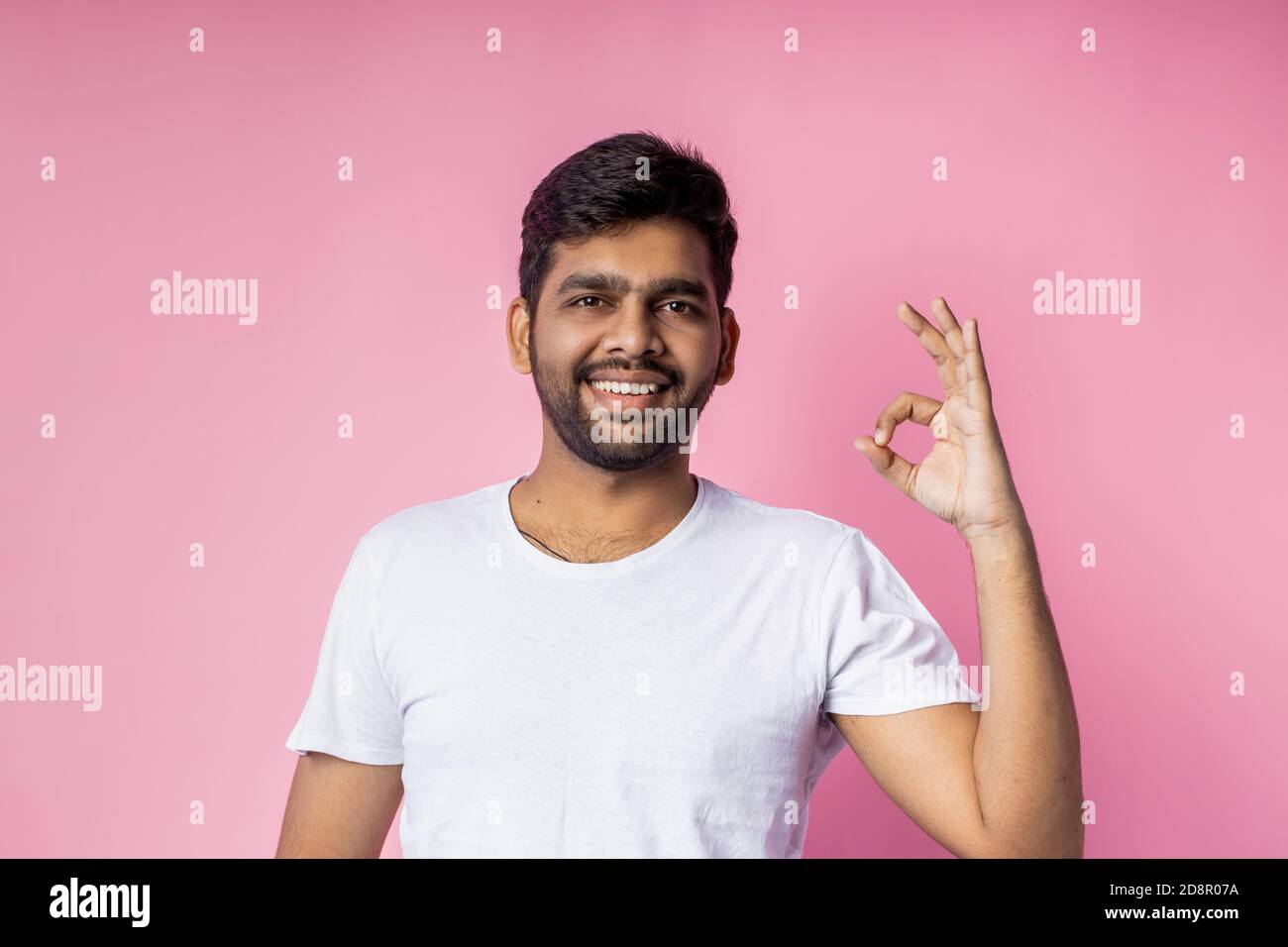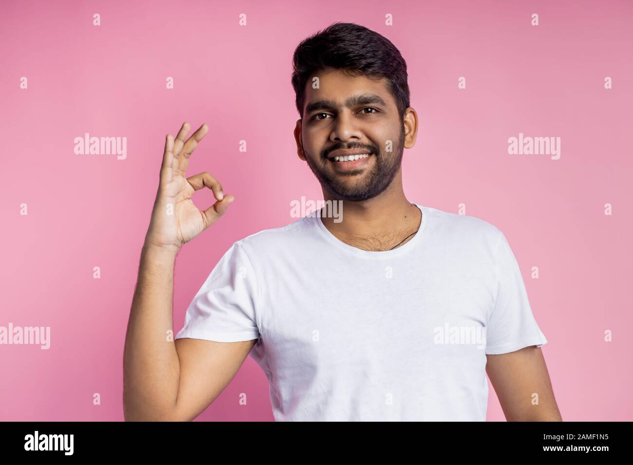 Body Language Concept Cheerful Indian Male Student Wearing White T Shirt Making Ok Sign Being Satisfied With Results Of Exam Smiling Joyfully Iso Stock Photo Alamy