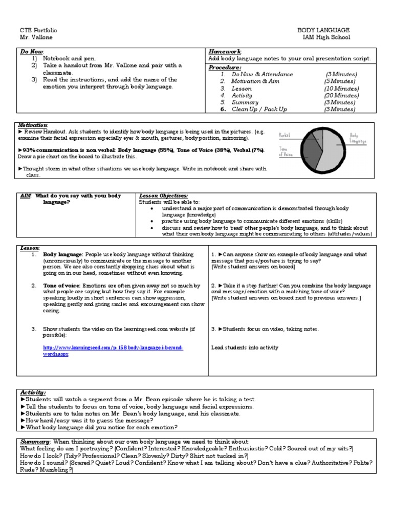 Body language 1 Body Language Is A Form Of Communication Whether you realize it or not, your body sends unmistakable signals to 2 There Is OPEN Body Language and CLOSED Body Language The definitions are transparent ‘open’ body language makes you 3 OPEN Body Language Means NO Crossing,. Student Body Language is based on the idea that, even in the age of the internet, most students’ professional success will depend on facetoface communication skills This program is an exciting and unique exploration of the way we communicate beyond words Throughout the program, mentalist Chris Carter teaches students how to be better listeners, correctly interpret the nonverbal signs others project, and use their own body language to create the best possible impression every time. Using expressive body language engages students and makes you and your lessons more memorable Body Language to Connect Experts advise using “open” body language to connect with students Crossing your arms, for example, appears guarded and closed off Similarly, avoid standing behind a desk or other barriers.