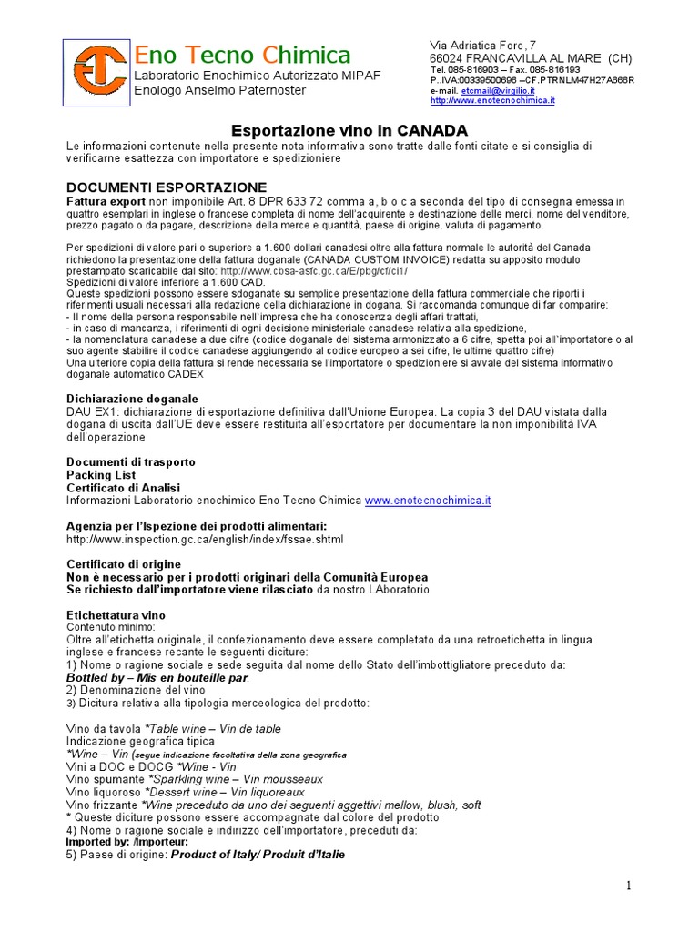 Esportazione Vino Canada