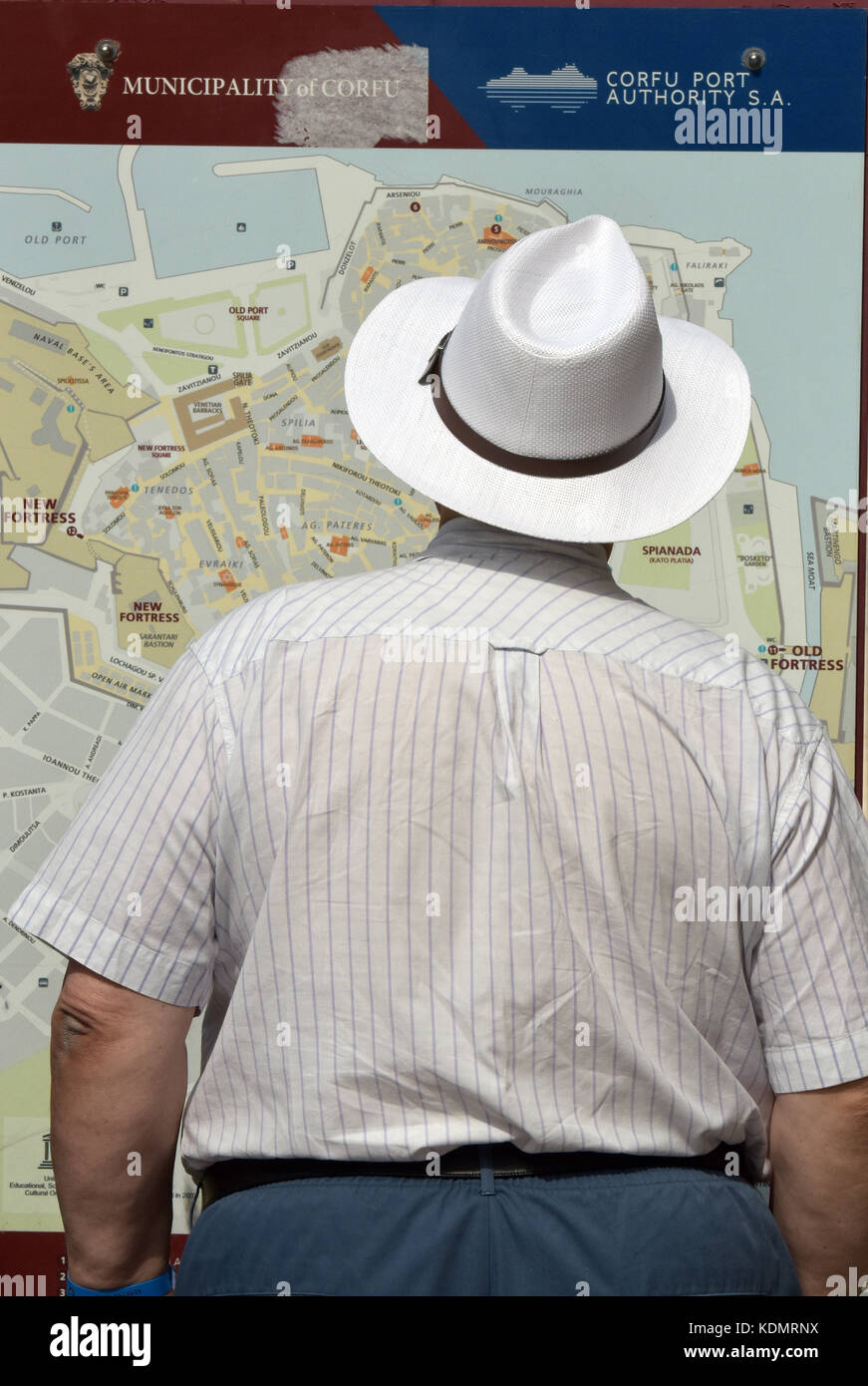 Un Uomo Che Indossa Un Tradizionalmente Britannico O Inglese Cappello Di Panama In Vacanza In Kerkira Cercando Una Una Mappa Per Trovare Le Direzioni Perso In Grecia Si E Ritirato Foto Stock