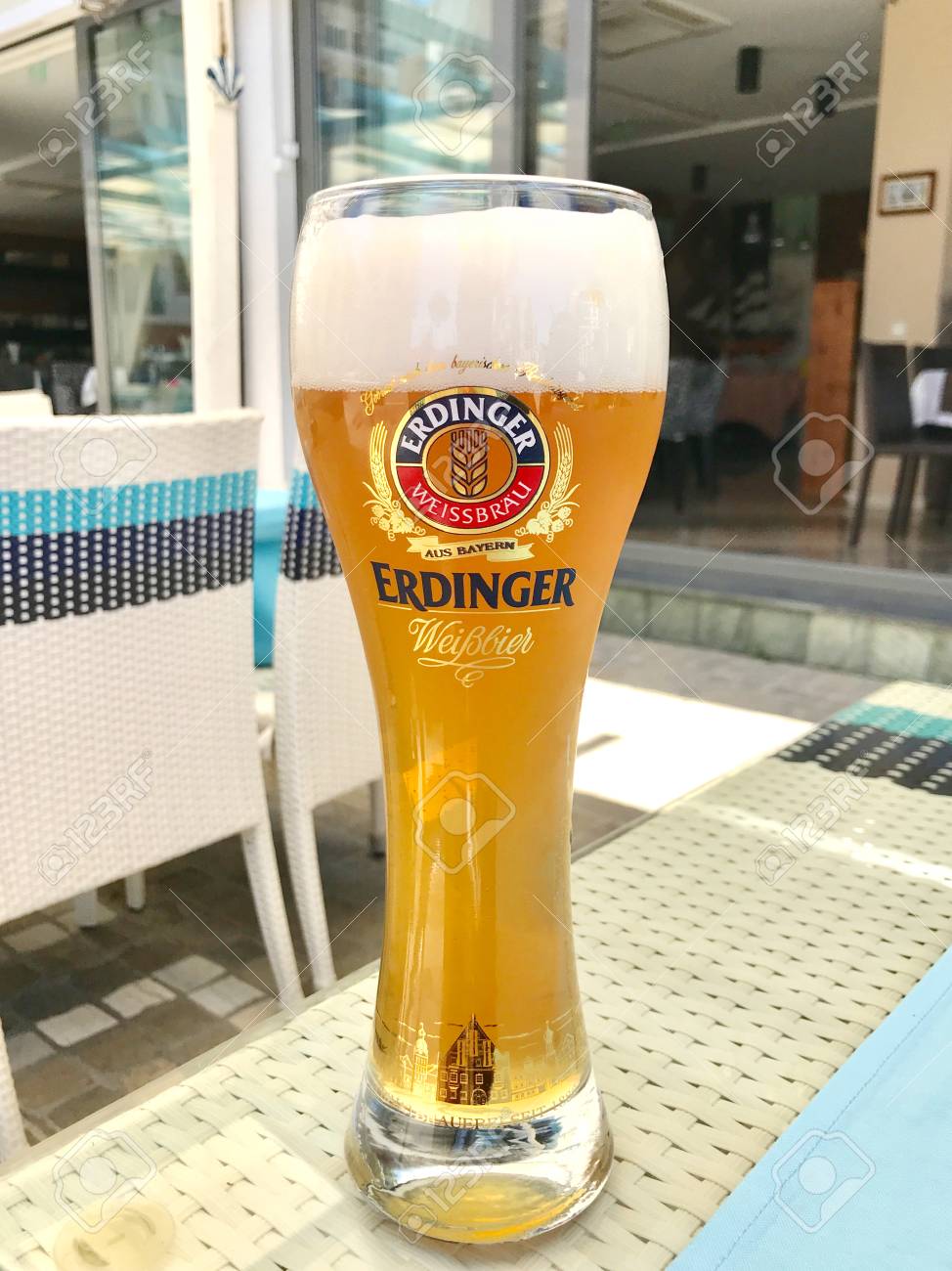 Immagini Stock Pomorie Bulgaria 30 Maggio 18 Bicchiere Freddo Di Erdinger Wei Bier Erdinger E Il Piu Grande Birrificio Di Birra Di Frumento Del Mondo Image