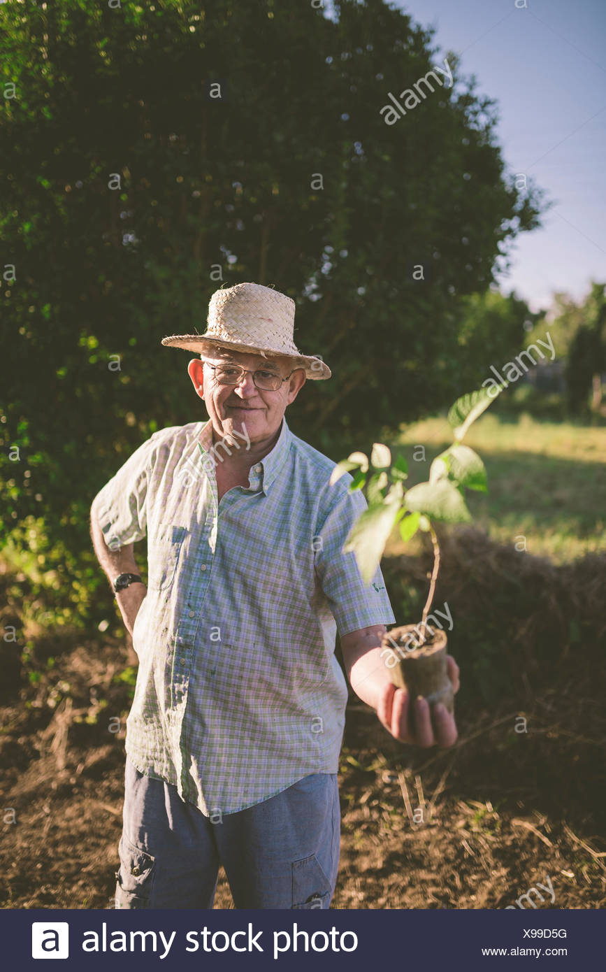 Ritratto Di Contadino Sorridente Che Indossa Un Cappello Di Paglia Con In Mano Una Pianta In Vaso All Aperto Luce Solare Stock Photo