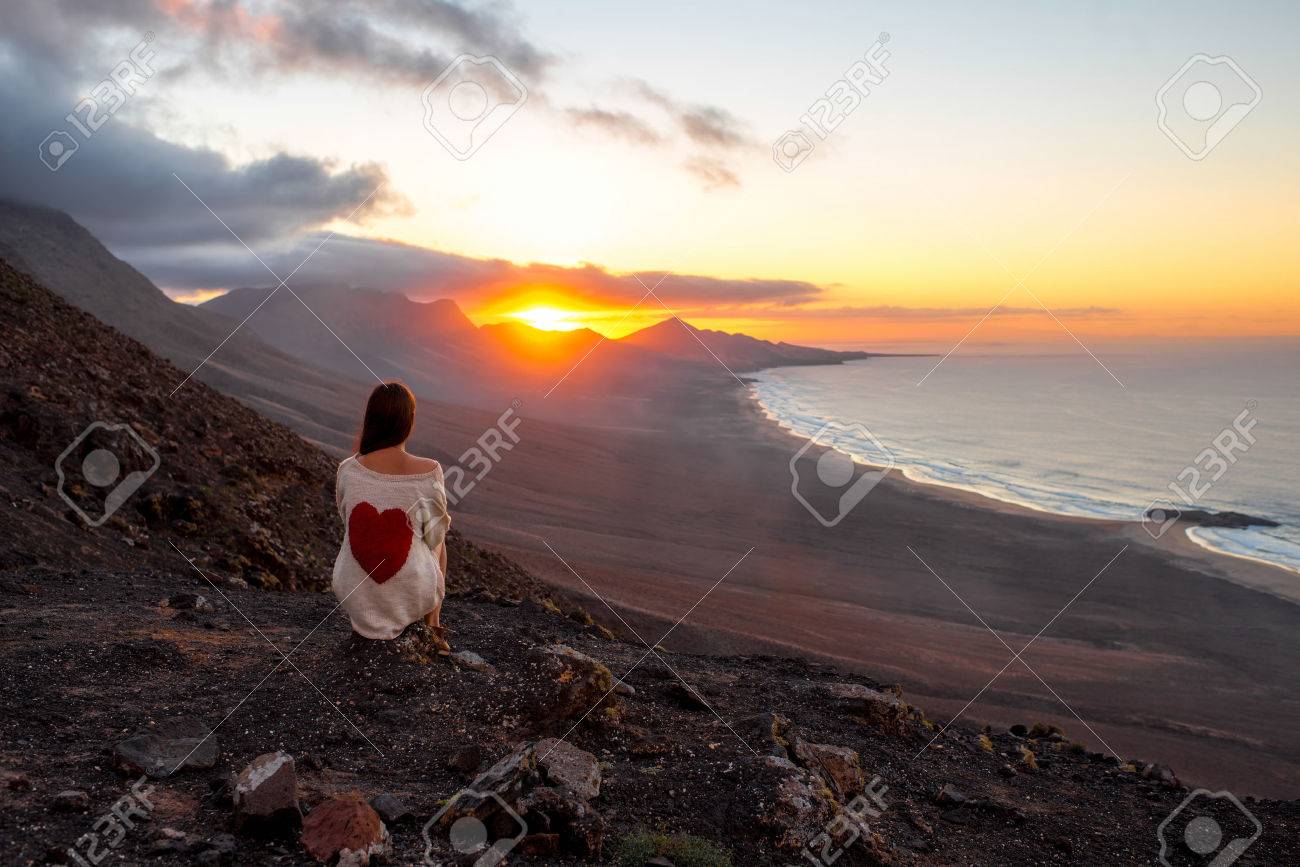 Mujer Joven Que Goza Hermosa Puesta De Sol Sentado En La Montana Con Gran Vista En Cofete Costa En La Isla De Fuerteventura Fotos Retratos Imagenes Y Fotografia De Archivo Libres De