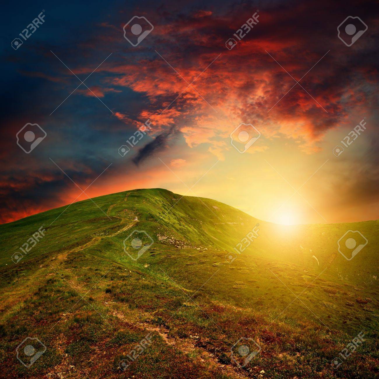Puesta De Sol Montana Increible Con Nubes Rojas Mas De La Colina Verde Fotos Retratos Imagenes Y Fotografia De Archivo Libres De Derecho Image