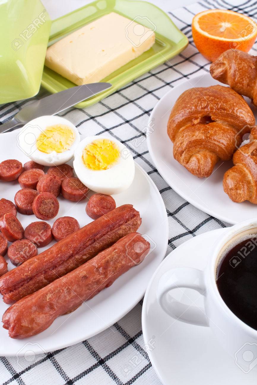 Comida Desayuno Cafe Negro Con Tres Rollos De Media Luna Y Salchichas Con Huevos Duros Fotos Retratos Imagenes Y Fotografia De Archivo Libres De Derecho Image