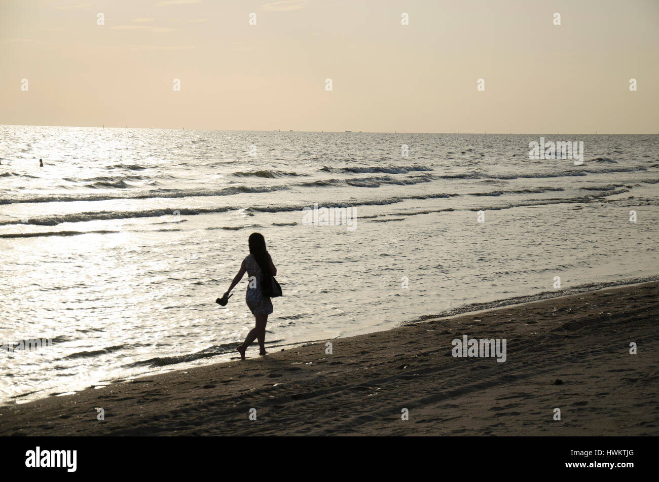 Viaggiatore Tailandese Donne Camminare Da Solo Sentirsi Soli Sulla Spiaggia Con Vento E Onde A Bangsaen Beach Nel Tempo Del Tramonto In Chonburi Thailandia Foto Stock Alamy