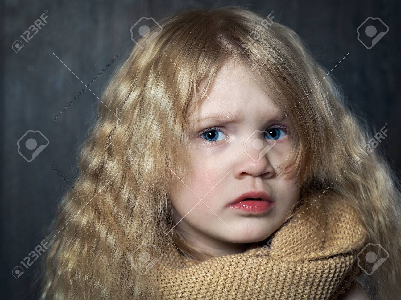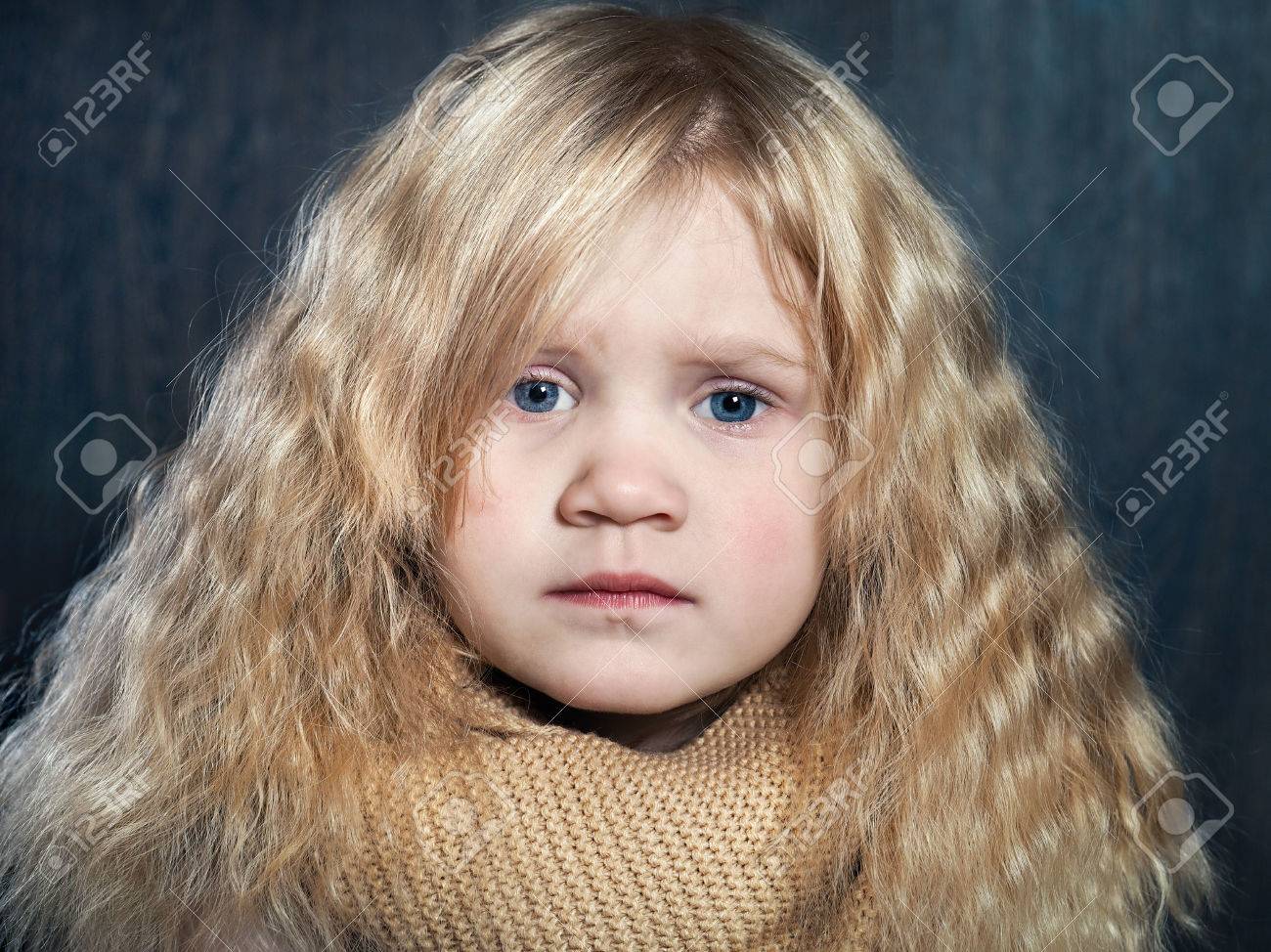 Immagini Stock Ritratto Di Bambina Triste E Molto Bello Capelli Biondi Fluffy Gli Occhi Azzurri Image