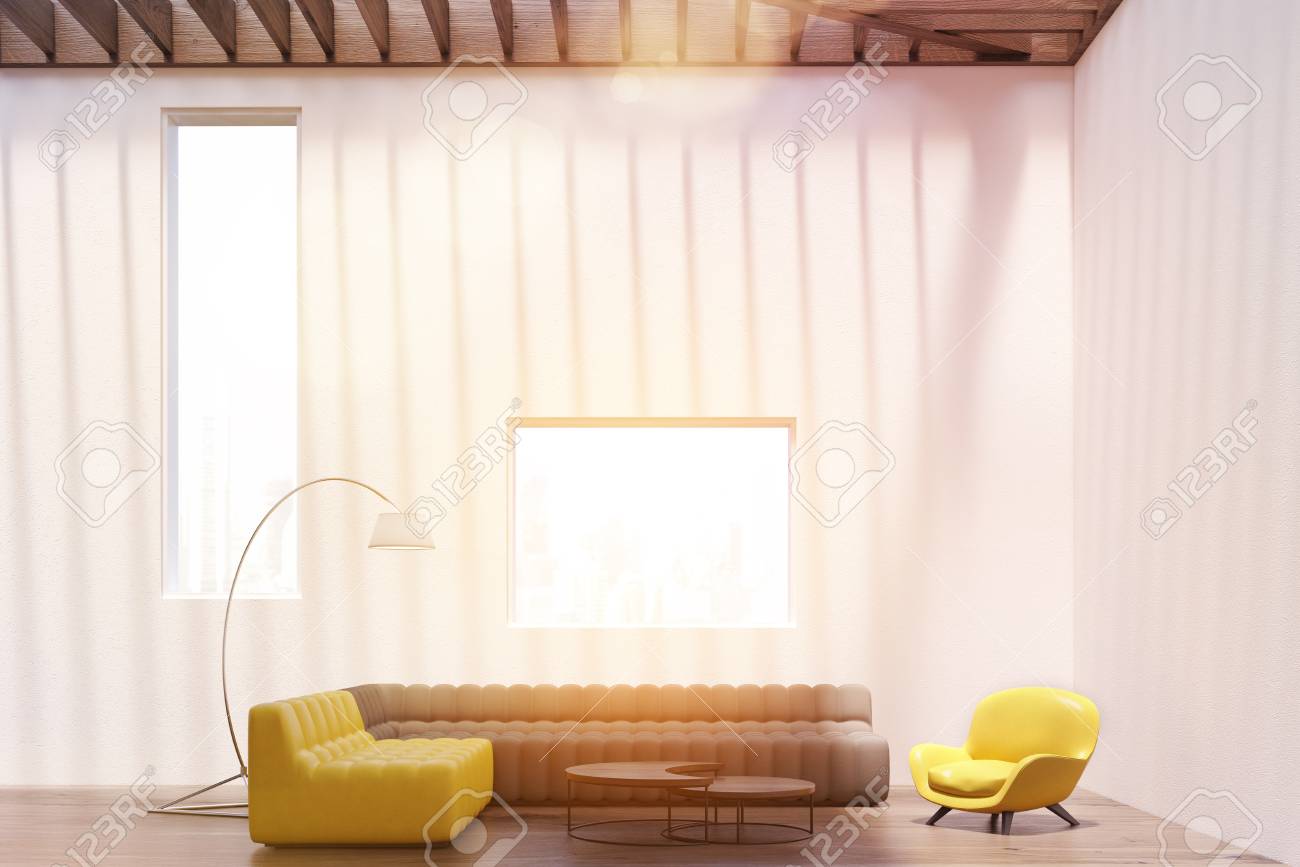Immagini Stock Interiore Bianco Del Salone Con I Sofa Gialli E Grigi Pareti Bianche E Piccole Finestre Rendering 3d Modello Immagine Tonica Image