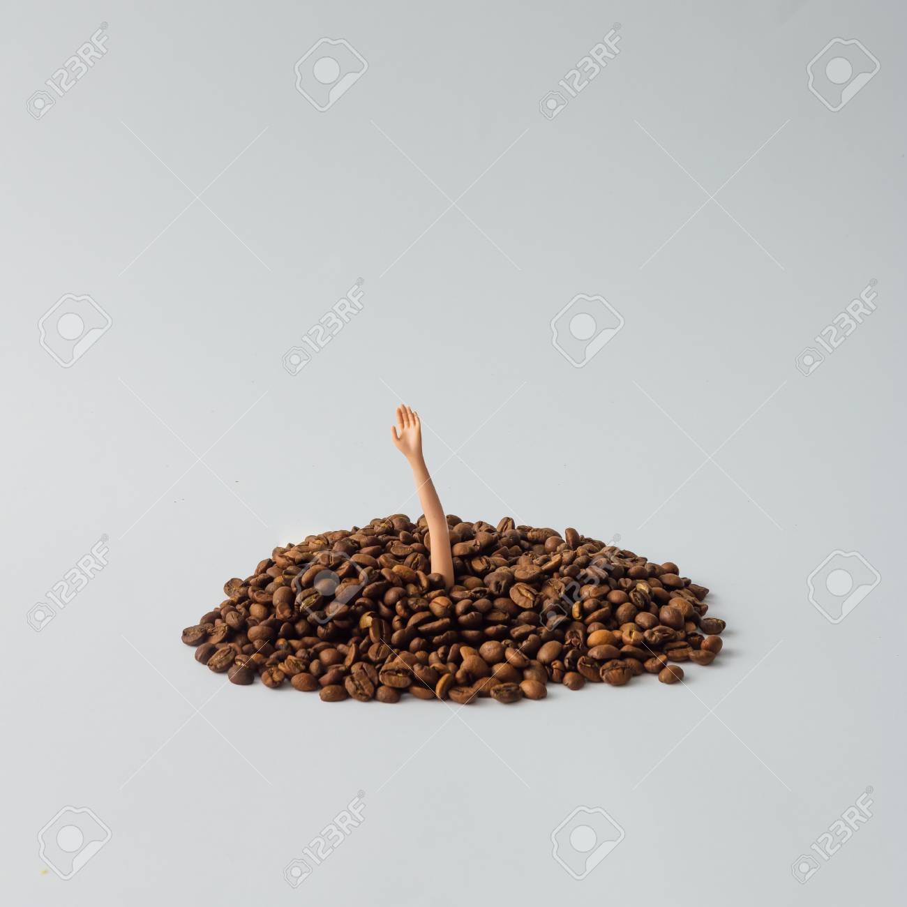 Immagini Stock Mano Di Bambola Che Emerge Da Un Mucchio Di Chicchi Di Caffe Concetto Creativo Della Bevanda Del Caffe Posa Piatta Unica Image