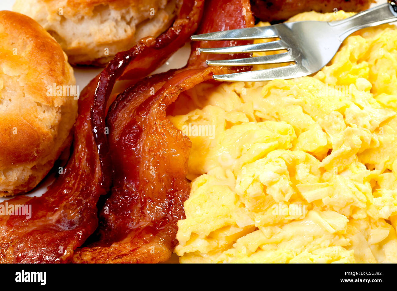 Primo Piano Di Uova Strapazzate E Pancetta A Fette Biscotti E Forcella Foto Stock Alamy