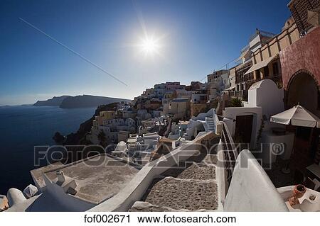 Greece Cyclades Thira Santorini Oia View Of Village And Aegean Sea Stock Image Fof Fotosearch