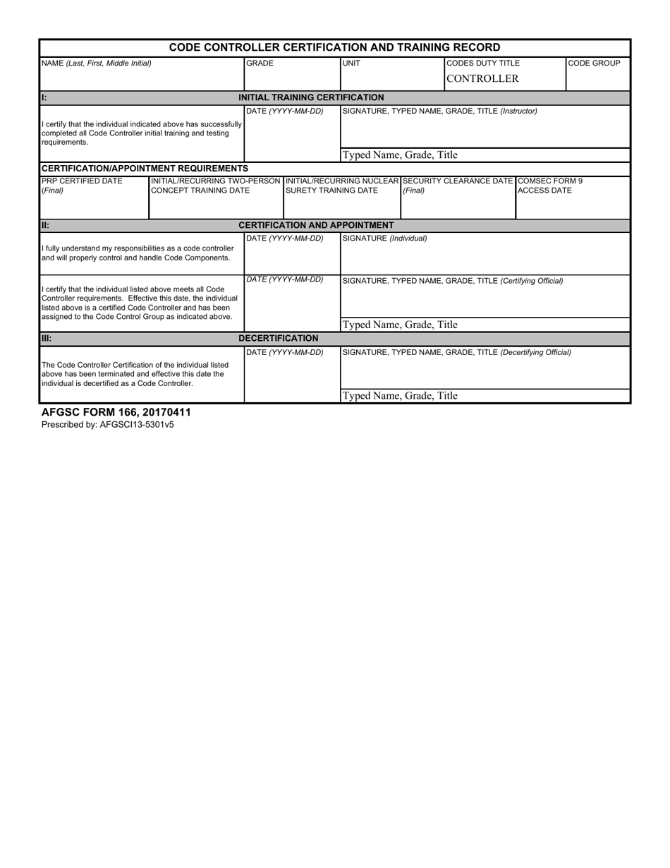 Afgsc Form 166 Download Fillable Pdf Or Fill Online Code Controller Certification And Training Record Templateroller