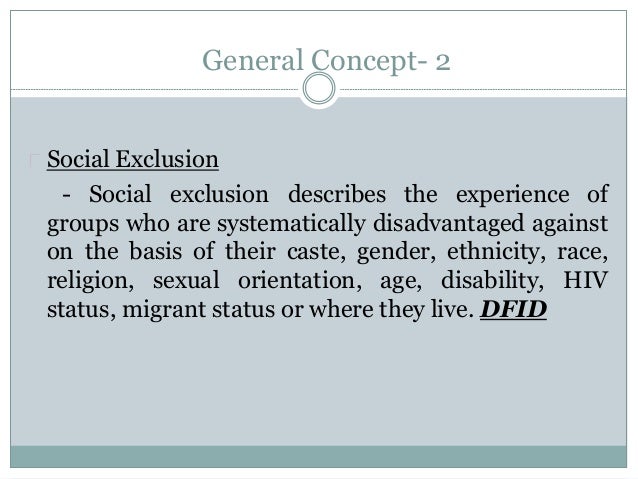Gender Equality and Social Inclusion Overview Overview;. Are involved in activities based on their personal preferences;. Social exclusion is a proces Social exclusion is not merely a condition that is the outcome of a process, but a process in itself Due to the multidimensional nature of social inclusion, it remains hard to interrelate these dimensions over time.