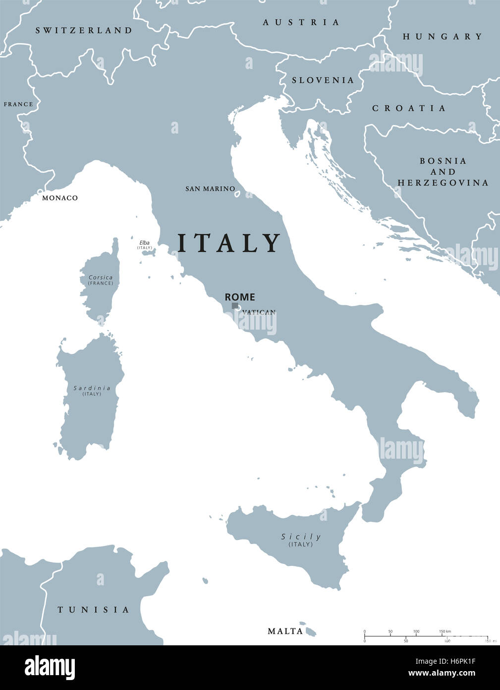 Italia Mappa Politico Con Capitale Roma Con I Confini Nazionali E I Paesi Vicini Illustrazione Di Colore Grigio Con Etichetta Inglese Foto Stock Alamy