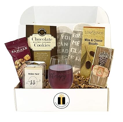 Amazon Com Wine Lovers Gift Box Wine Gift Basket Socks Stemless Glass Wine Snacks Gifts For Him And Her Liquid Therapy Grocery Gourmet Food