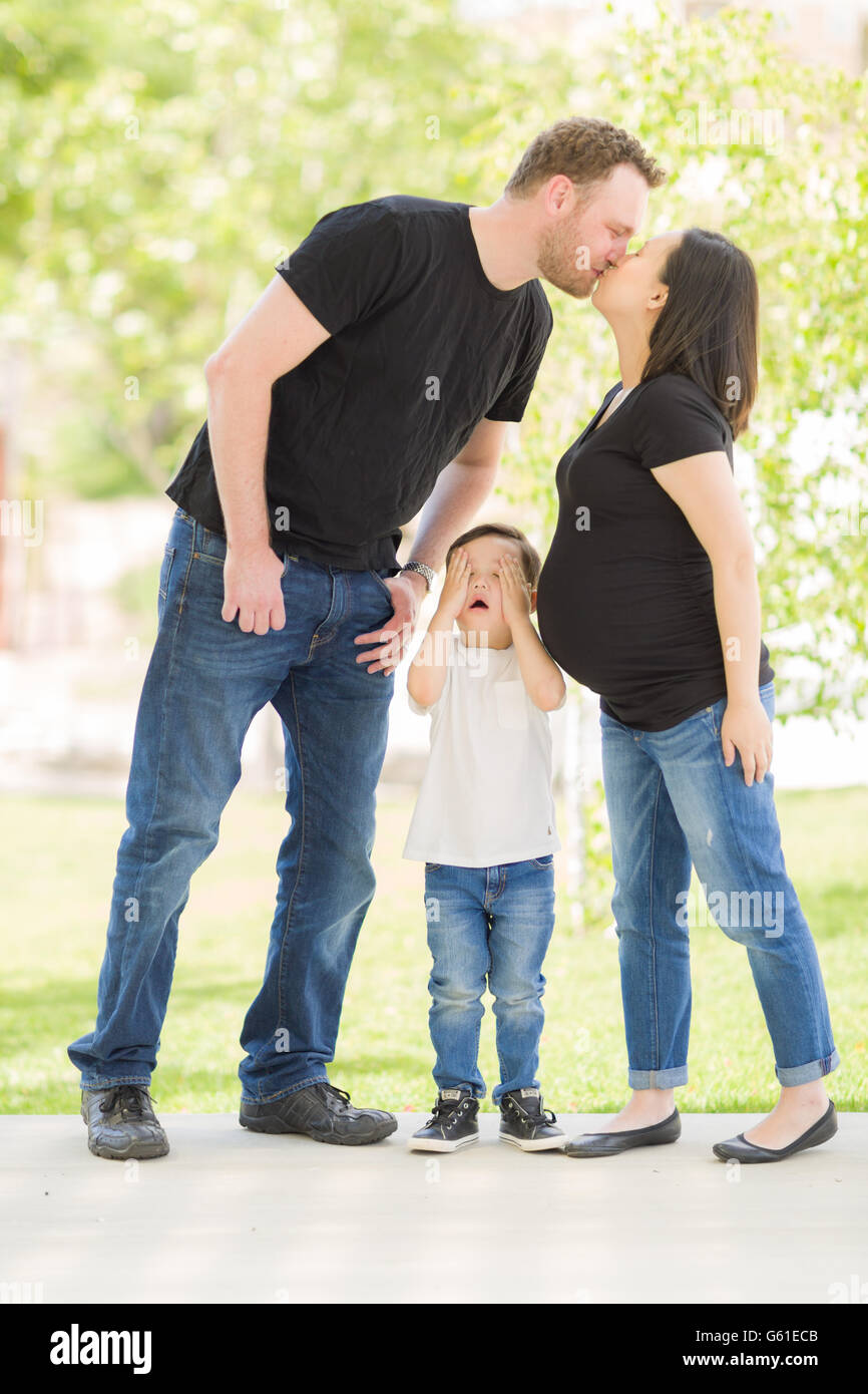 Giovani Razza Mista Figlio Nasconde Gli Occhi Come La Gravidanza Mamma E Papa Kiss Foto Stock Alamy