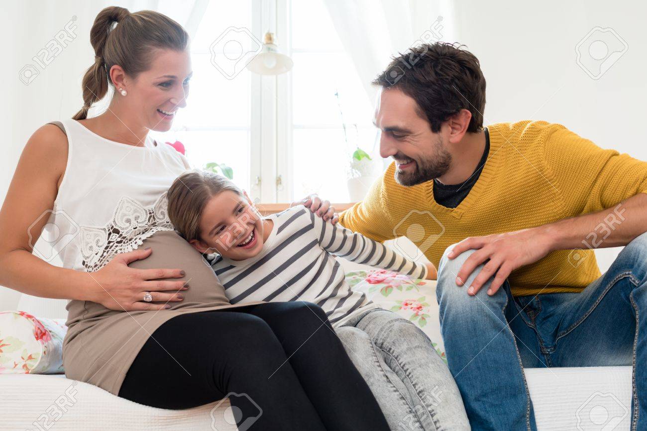 Immagini Stock Bambina A Casa Con Mamma E Papa Ascoltando Il Ventre Della Madre Incinta Image