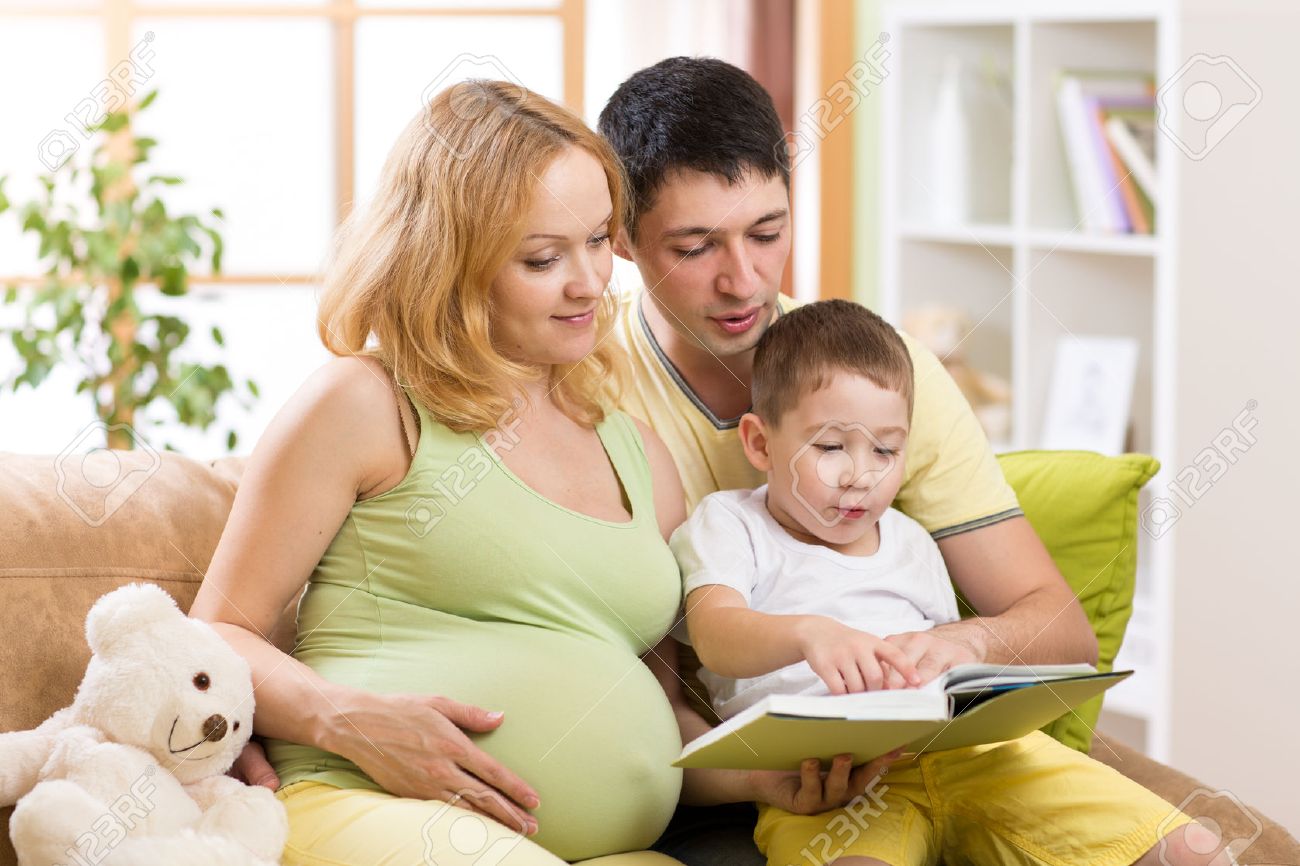 Immagini Stock Genitori Felici Papa E Mamma Incinta Libro Per Bambini Che Leggono Insieme Sul Divano Di Casa Image