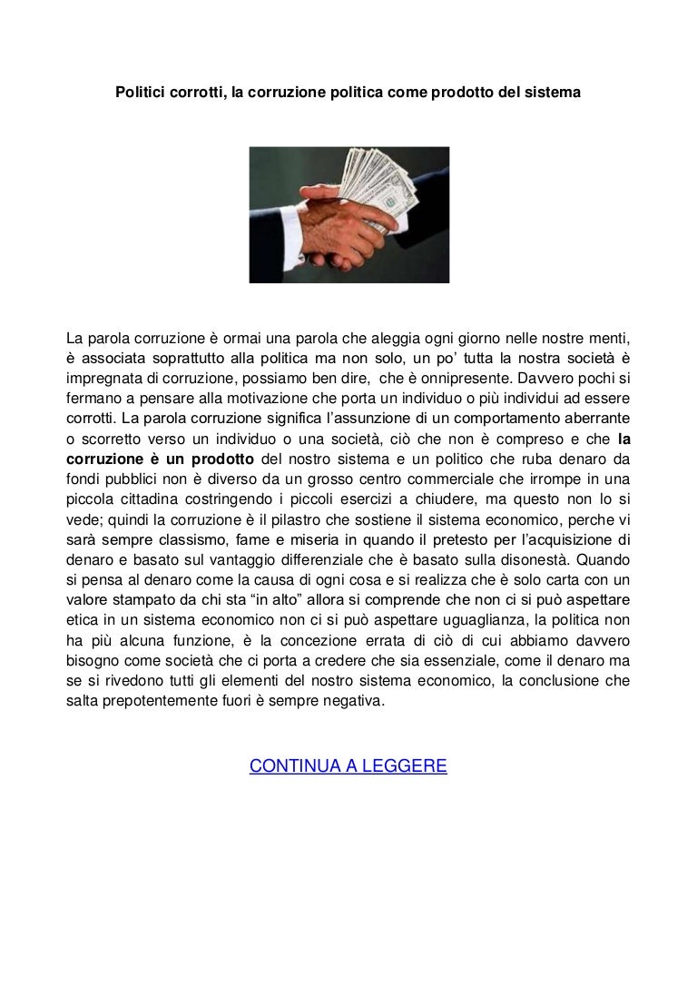 Politica, tema Tema di italiano sulla politica sotto forma di articolo di giornale in vista delle nuove elezioni politiche in tutta Italia e in ogni italiano sorgono naturali delle domande. Perchè il denaro pubblico sperperato dai politici corrotti e collusi con tutte le mafie ha alimentato il sistema malato che ci ha portato al baratro economico e morale attuale,è quindi giusto estendere il 41 bis e la confisca dei beni a titolo di risarcimento al popolo italiano, a tutti quei politici accusati e giudicati colpevoli di reati di collusione e corruzione. LA LISTA DEI POLITICI INDAGATI E CORROTTI mercoledì 29 maggio 13 Corruzione dilagante, ecco la lista dei politici indagati e corrotti NOCENSURA Corte dei Conti corruzione dilagante, ecco la lista dei politici indagati e corrotti e ora anche in Germania Il presidente tedesco Christian Wulff ha annunciato le sue dimissioni!!.