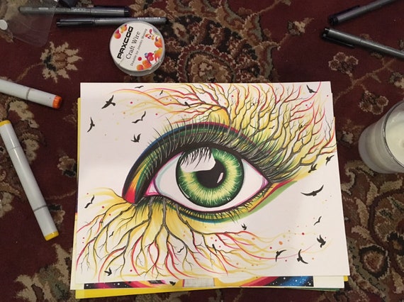 Green Eye Art Print Eye Drawing Birds Tree Colorful Prints Etsy