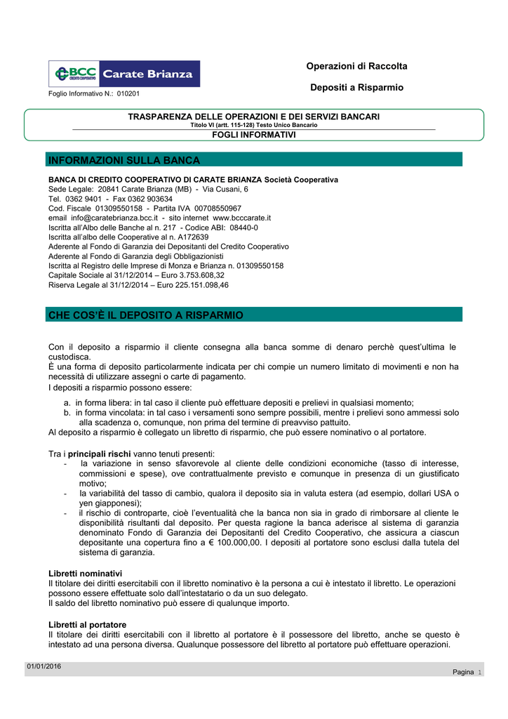 Foglio Informativo N 1 Deposito Al Risparmio Pdf Free Download