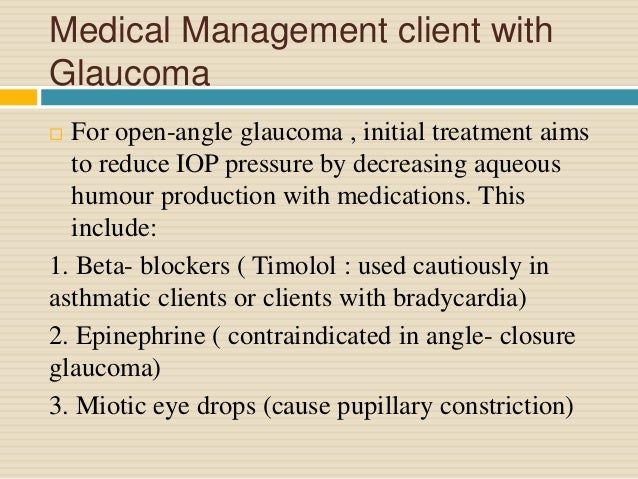 The medical management of glaucoma Andre Marais, 1 Elzbieta Osuch 2 1 Department of Pharmacology, School of Medicine, Faculty of Health Sciences, University of Pretoria, South Africa. Various treatment options, including medical and surgical interventions are accessible in the management of glaucoma This article contains a brief description on the pathophysiology and focus on. Glaucoma is usually controlled with eyedrop medicine Used every day, these eye drops lower eye pressure Some do this by reducing the amount of aqueous fluid the eye makes Others reduce pressure by helping fluid flow better through the drainage angle Glaucoma medications can help you keep your vision, but they may also produce side effects.