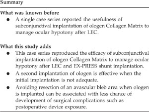 Subconjunctival Implantation Of Ologen Collagen Matrix To Treat Ocular Hypotony After Filtration Glaucoma Surgery Eye